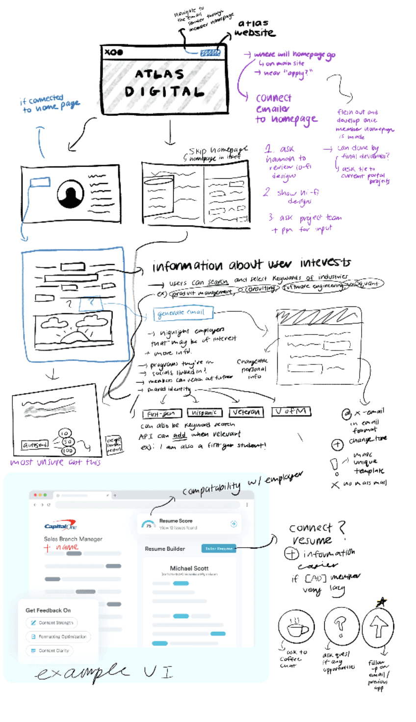 My low-fidelity storyboard outlines the full user flow of the recruiter outreach platform within the Atlas Digital portal, prioritizing functionality. Members begin on the site, connect their email, and input profile details and industry keywords (like product, consulting, or software engineering).